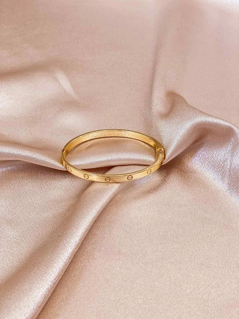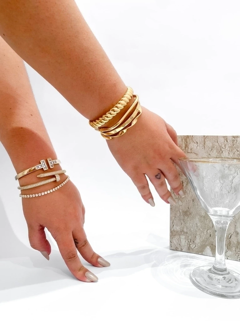 Esse modelo de peça é essencial em seu porta acessórios. Bracelete com detalhes similar á cabeça de parafuzos. Com fecho de encaixe.Os braceletes são perfeitos para deixar seu look mais despojado e possui um estilo moderno, leve e confortável.