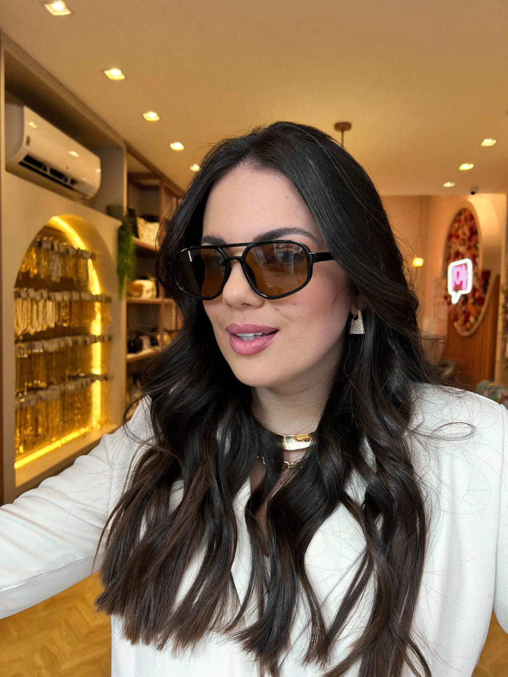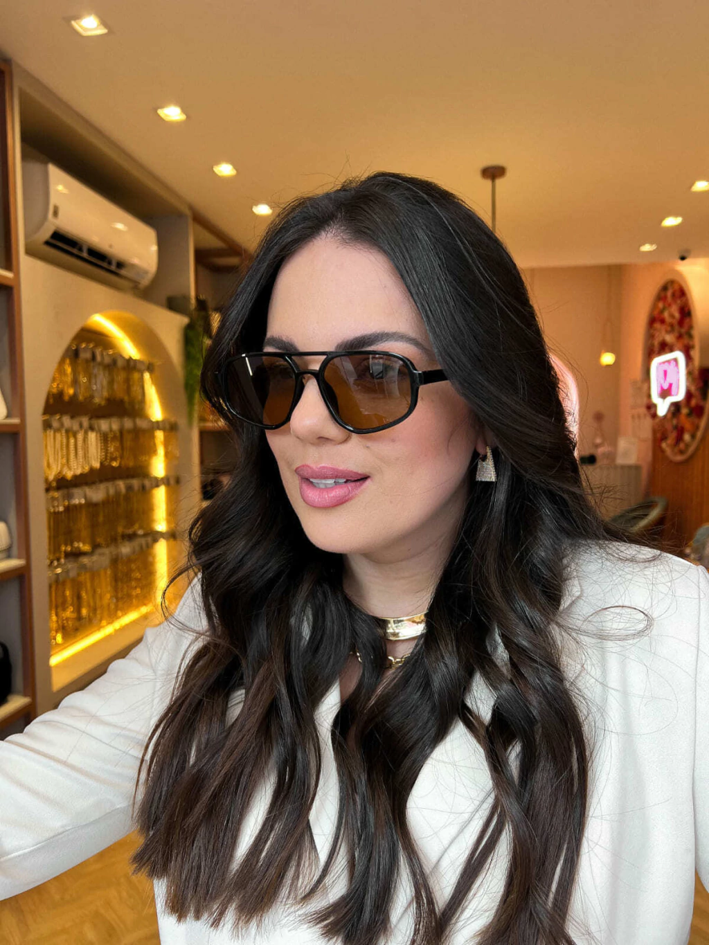 Com design inspirado no clássico modelo aviador, este óculos de sol combina armação em acetato preto brilhante com lentes âmbar que oferecem proteção contra os raios UV e um toque retrô elegante. A ponte dupla adiciona um ar moderno e marcante, enquanto o formato anatômico garante conforto no uso diário. Versátil e estiloso, é a escolha perfeita para quem busca um acessório que eleva qualquer look com personalidade e sofisticação. Arrase com Line!!